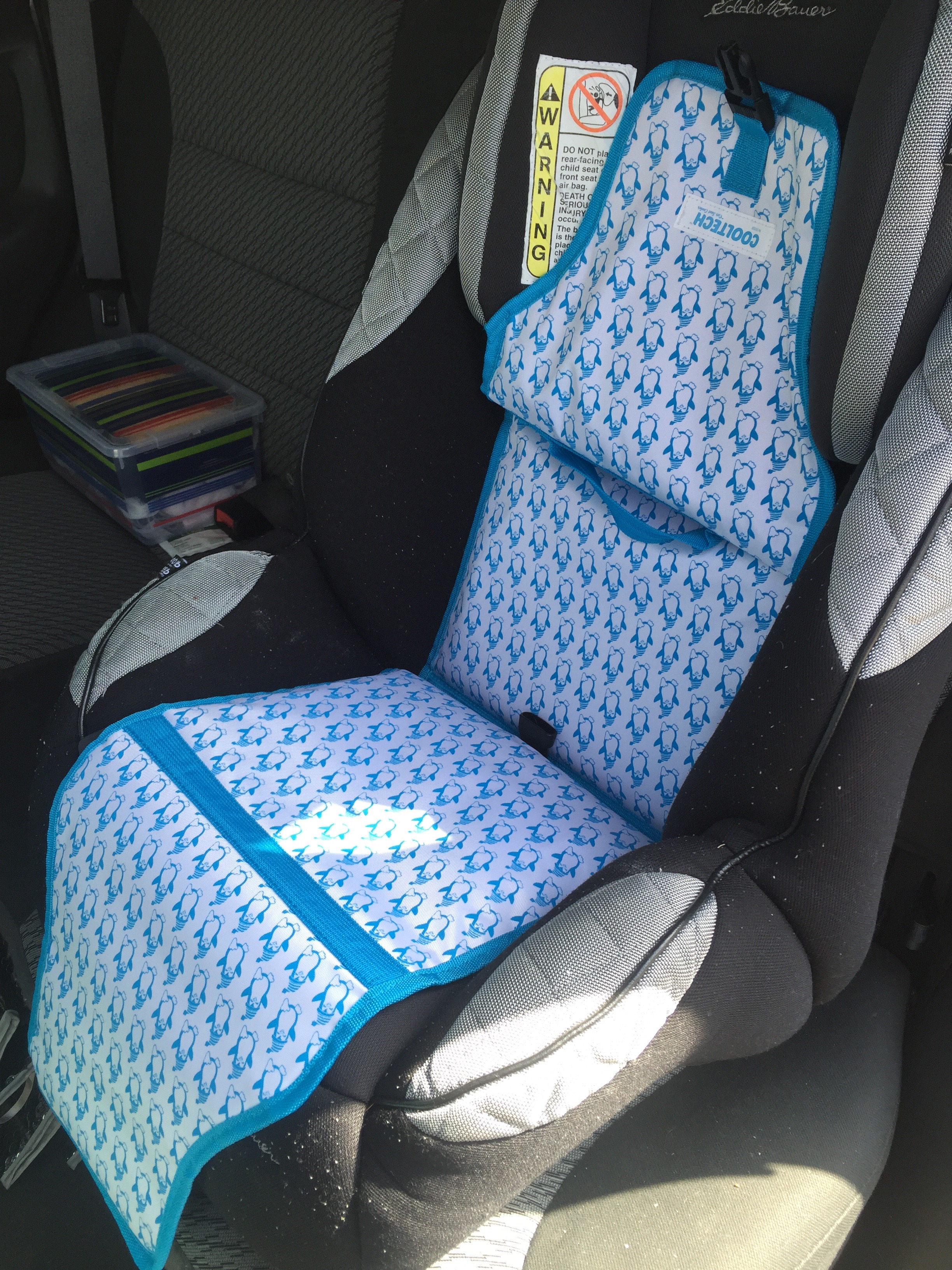 Apparently I’m not the first parent to have this problem, so someone created a “Car Seat Cooler.” Basically, it’s a foldable ice pack the size of the car seat that you place in the car seat for about 10 minutes to cool the seat down before you place the child in the seat. (Don’t worry, you remove it before the child gets in the seat, so they are not sitting on an ice pack!) I know it is $40 (which seems like a lot for an ice pack), but I really thought it could be worth it, so I bit the bullet and bought one on Amazon to test out.