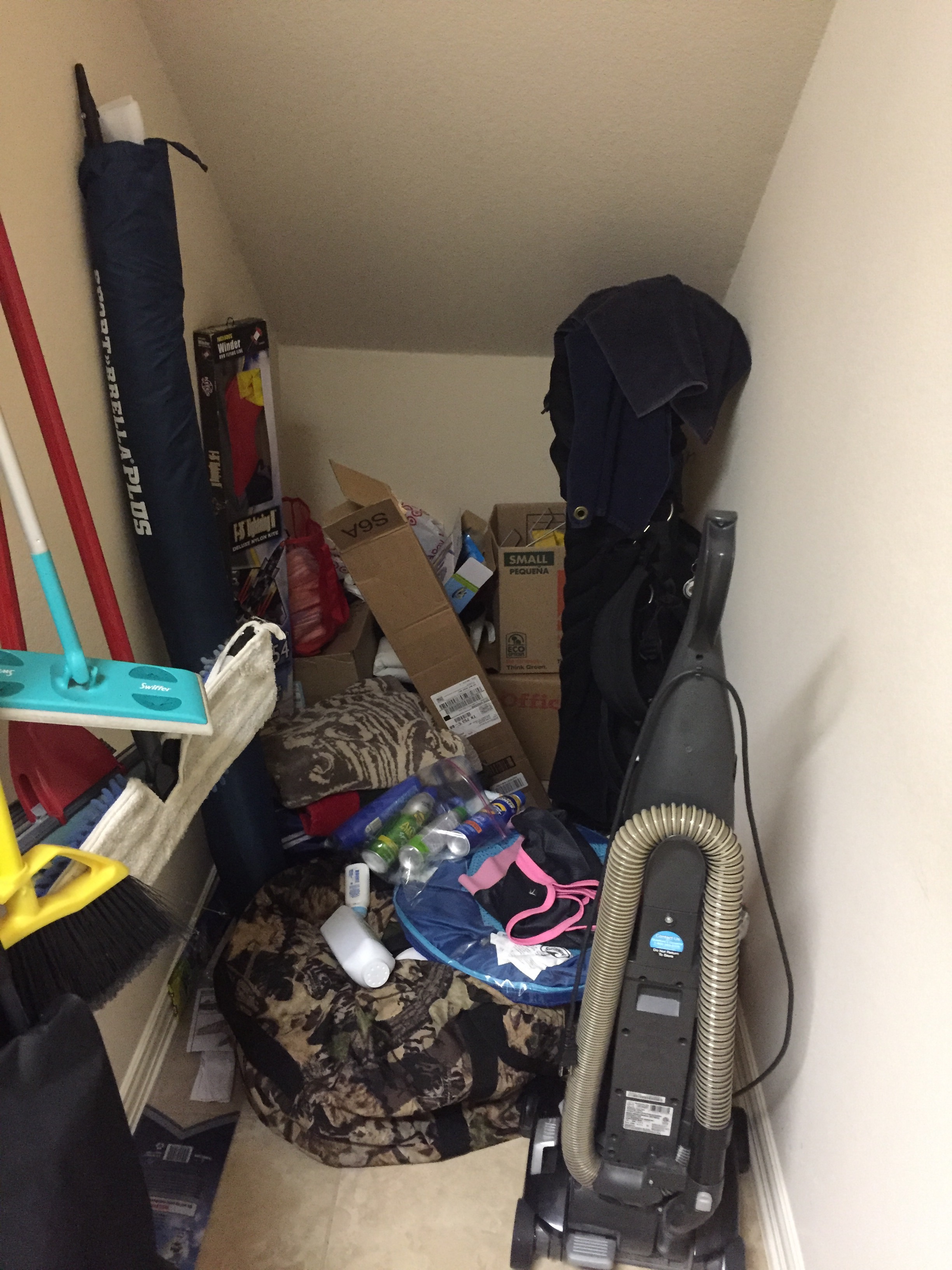 We also have a storage area in the laundry room under our stairway, so I organized all of the items to make more efficient use of the space.