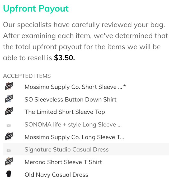 Yes, they gave me $3.50 for 8 items. Whhhhhaaaatttt??? To be fair, the website does have a payout calculator that will give you an estimate for what you’d receive for certain items. And these were my lower-value items to begin with. So I knew the payout would be low, but I didn’t think it would be THAT low. I had about 9 other higher quality items in the bag that ThredUP didn’t immediately pay me for. Those items were listed for consignment and I would be paid upon sale….if the items sell. Even still, my estimated payout for those items was still only about $30, and I had some really great pieces, if I do say so myself.