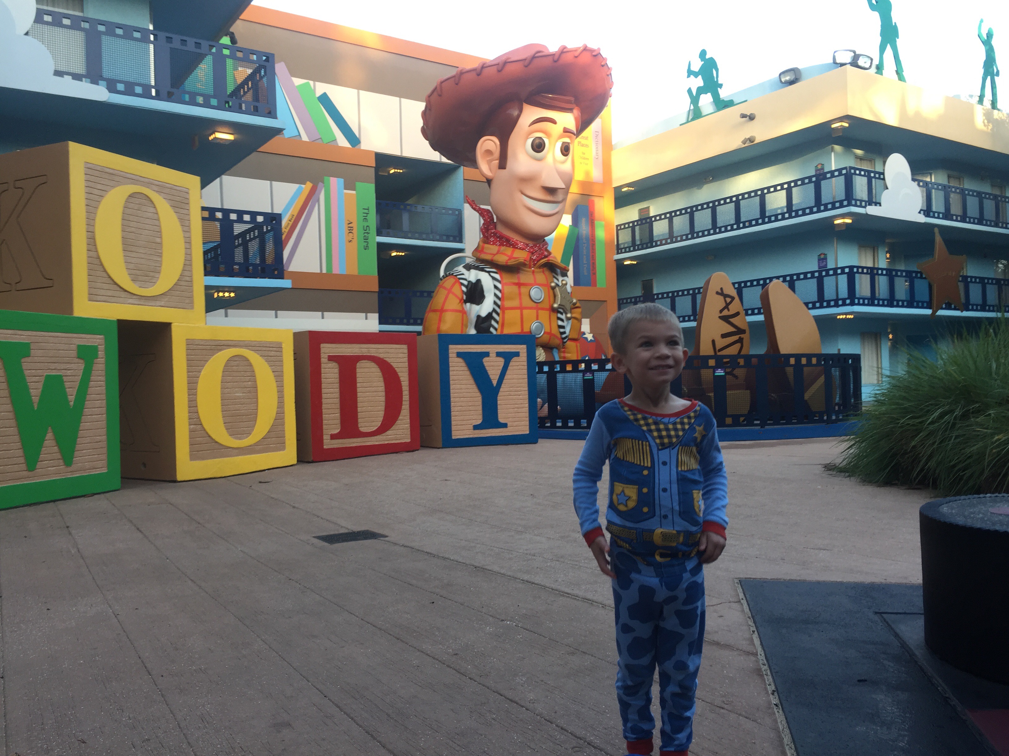 The theming was fabulous, especially if you have a Toy Story fan. We entered through a door to “Andy’s room” to get to our building, and were surrounded by HUGE Toy Story figures. Turner loved it! The rooflines were lined with army men and it really was a fun atmosphere. Turner posed for pictures with Woody and Buzz a couple of mornings because he had to show them his PJs!